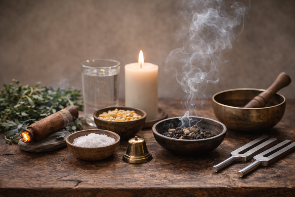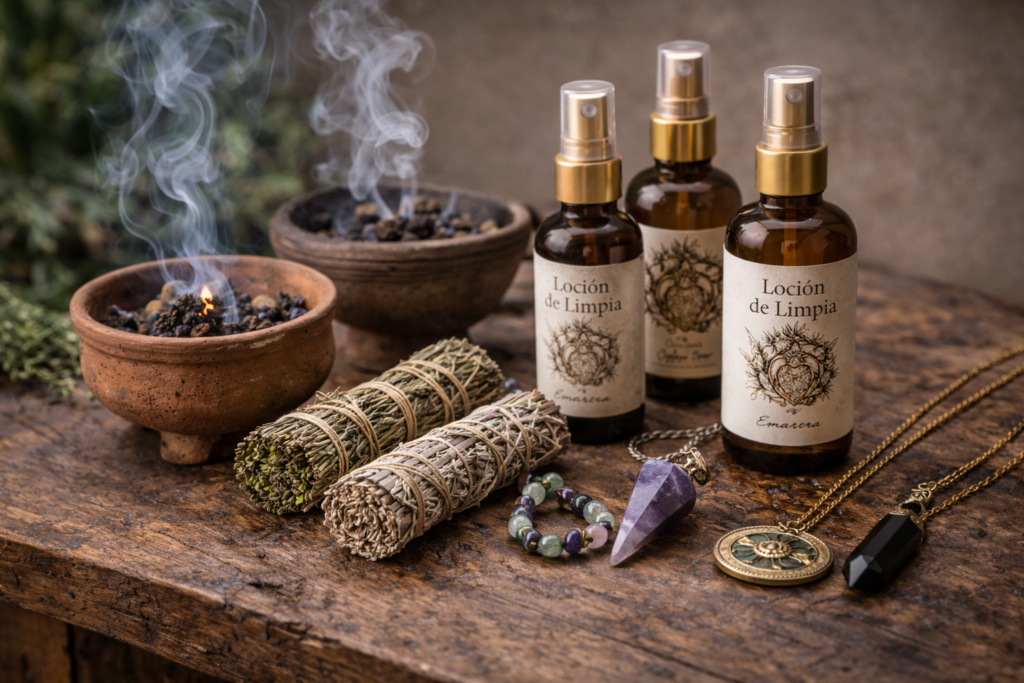Las lociones de limpia, bundles de hierbas y piezas de joyería energética no sustituyen el trabajo de fondo, pero lo sostienen en el día a día.